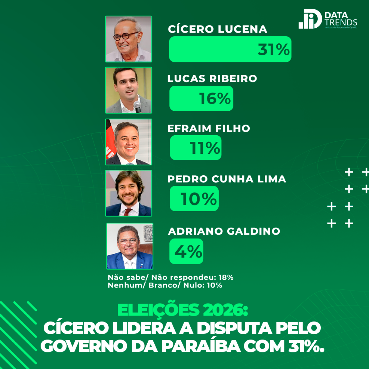 No levantamento, Cícero Lucena (MDB) lidera com 31% das intenções de voto, seguido por Lucas Ribeiro (PP) 16%, Efraim Filho (UB) 11%, Pedro Cunha Lima (PSD) 10% e Adriano Galdino (Republicanos) 4%. Outros 18% afirmaram que não votariam em nenhum dos nomes apresentados, enquanto 10% não souberam responder.